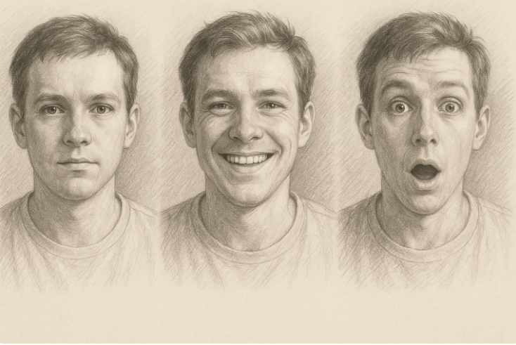 顔全体を見渡すと、目・眉・口の位置関係には一定の「表情リズム」があります。たとえば、驚きでは眉と瞼が上がり、口も開く。