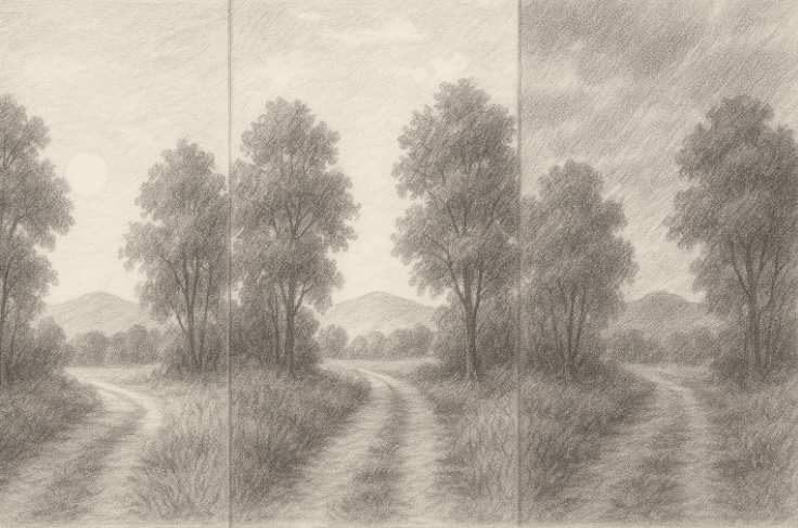 風景の鉛筆画やデッサンにおいて、光は単なる明るさではなく「時間」と「空気感」を伝える要素です。朝焼けの柔らかい光、正午の強い影、夕方の逆光、曇天の拡散光など。