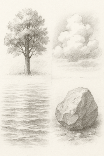 質感を描き分ける基本は、「柔らかいもの=ぼかす」「硬いもの=エッジ(縁)を立てる」「透明なもの=余白を残す」。木・雲・水・岩の違いは、線の方向と境界処理で決まります。