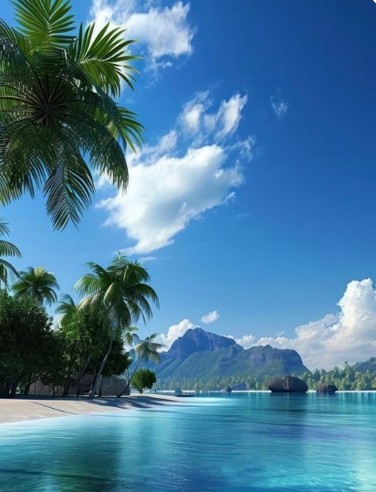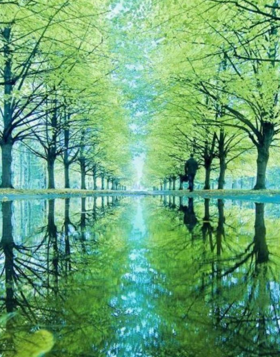 空や岸の映り込みは、少し歪めて配置すると、自然な水面の揺らぎが出ます。次の作品を参照してください。