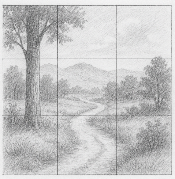 スケッチブックや紙面を縦横3分割し、交点付近に主役モチーフ(木・岩・建物など)を配置してスケッチします。