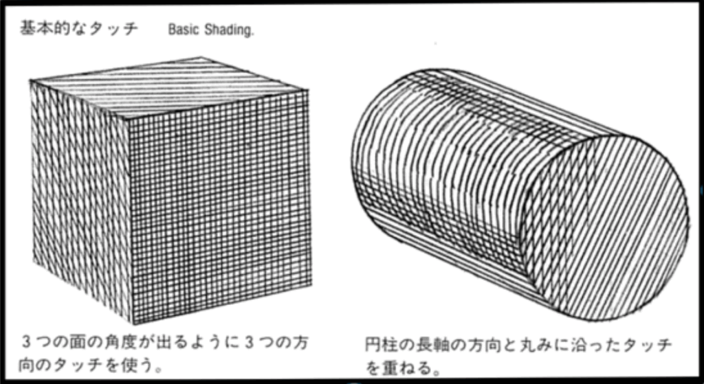 ※ クロスハッチングとは、縦横斜めの4種類の線を使って面を構成する方法ですが、描きにくい方向からの線は、スケッチブックや紙側を90°回転させることで、無理なく描けます。
