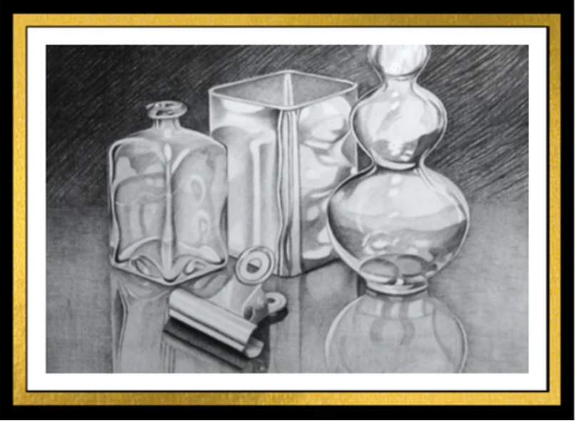 モチーフの近くにある部分や、光の当たる角度が強い部分はシャープな線で描き、遠ざかる部分や影の中は柔らかい線にすることで、空間的な変化が滑らかに伝わります。次の作品を参照してください。
