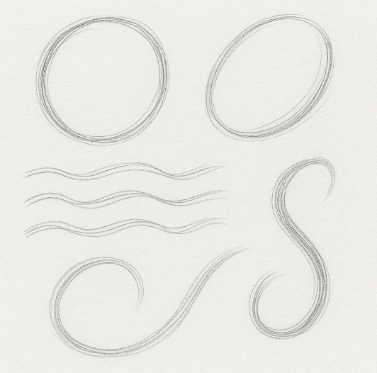 まっすぐな線、円、楕円、波線を毎日描くことで、手のコントロール力は確実に向上し、制作のあらゆる場面で応用が効くようになれます。基本形を無理のないリラックスして描く習慣は、描線の質を高める最短ルートです。