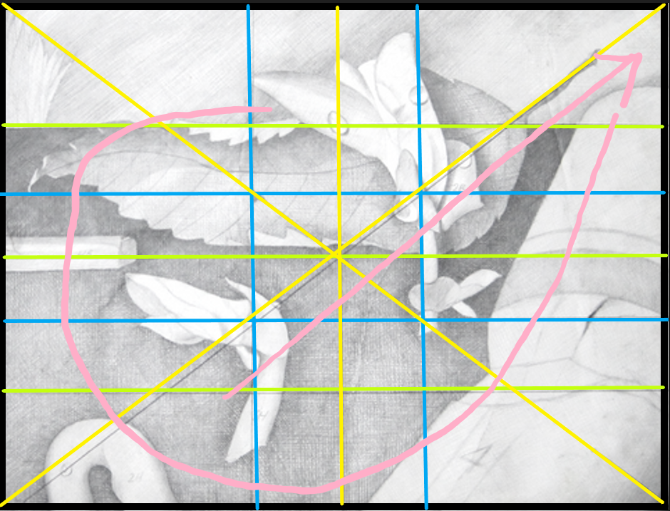 そして、構図基本線の、対角線・縦横の2分割線にも扱い方を工夫して、観てくださる人の導線を暗示できるように、エスキースの段階からしっかりと「構想」を練りましょう。