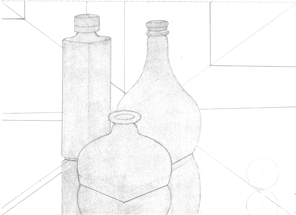 また、モチーフ3点を使って「逆三角形」の構図も形成して、輪郭のデッサンを完成させましたら、画面左上から右下に通っている斜線の位置を暗示するために、球体も配置します。