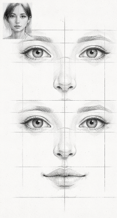 最初に中心線を引き、目の高さ、鼻の長さ、口までの距離を観察しながら進めてください。