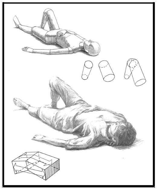 具体的には、仮に人物を描く場合であれば、描き始め当初は、頭を「球体」・胸板を「箱」・足や腕を「筒」など、大雑把に全体を捉えて、その後徐々に形を整えていくというようなことです。次の画像を参照してください。