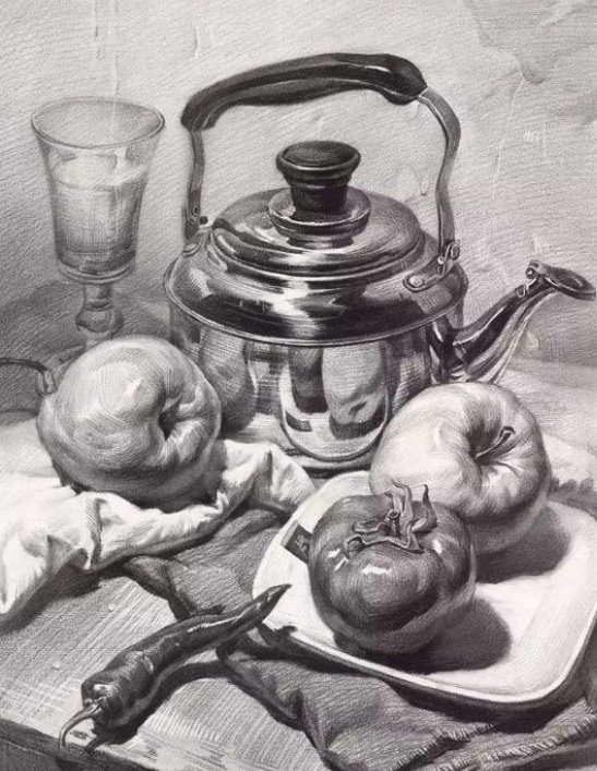 一枚の、静物の鉛筆画やデッサンでは、どれを主軸にするかを決めて、他の要素はそれを支えるレベルに留めることが大切です。