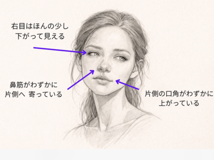 その結果、目の傾きや左右差、まぶたの厚み、鼻筋の方向といった個人差の要素が抜け落ち、誰を描いても似た顔になりやすくなるのです。