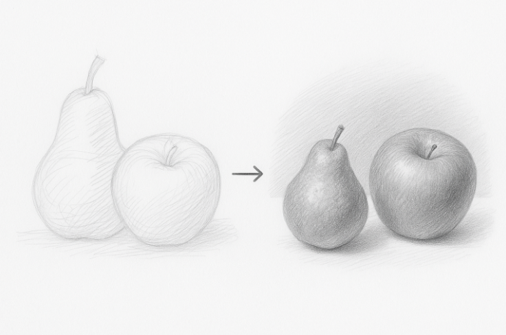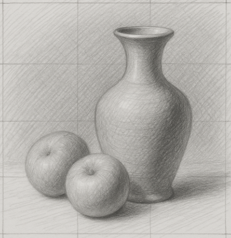 鉛筆画やデッサン中級者になると、単に形を写すだけでなく、下絵段階で構図・光と影・質感の方向性を意識することが求められます。