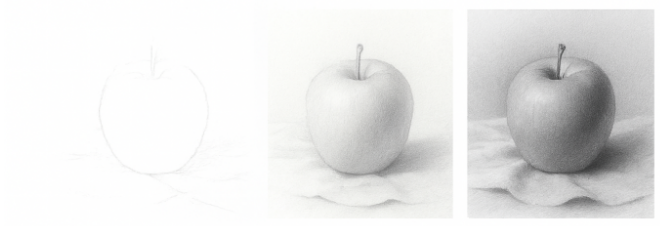 同じ下絵を使い、3段階に分けて描き進めます。第1段階では形の確認、第2段階では最暗部を入れ、第3段階で中間トーンの配置、完成へ導きます。