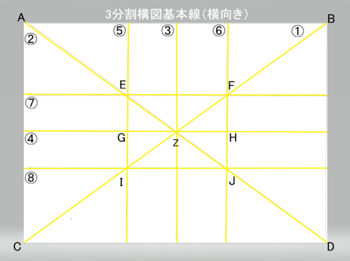 そして、主題(主役や準主役、以下主題)を⑤や⑥に配置しますが、たとえば、モチーフがリンゴだとすれば、交点EFIJのどれかを中心にして描くということです。