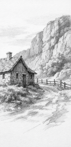 写真では、近景から遠景まで同じ解像度で情報が写り込みますが、風景デッサンでは距離による情報量の差を意識的に作る必要があります。
