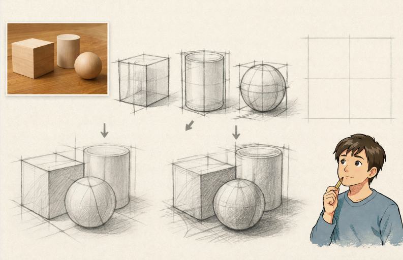 構造で捉えるとは、物体を単純な立体に置き換えて理解することです。箱、球、円柱といった基本的な形に分解することで、奥行きや方向性が明確になります。これにより、比率の精度だけでなく、空間的な説得力も向上します。