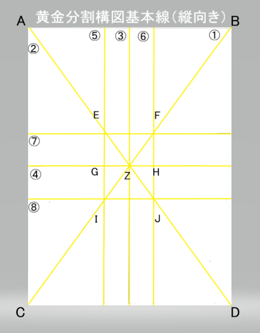 - 図解:縦横3分割+主題と背景の配置ガイドライン付き図。