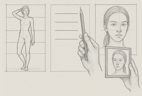 鏡や写真、補助線といった手法を組み合わせ、プロポーションの狂いを早期に発見し修整する習慣を持てば、安定した構図と比率で描けるようになれます。