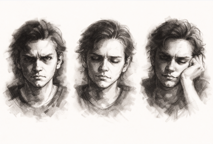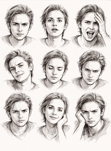 輪郭や細部を使わず、影の配置と濃淡だけで表情を描く練習も非常に効果的です。感情が動くと、筋肉の緊張が変わり、それに伴って影の形やつながりも変化します。