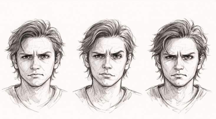 影は、単に顔を立体的に見せるための要素ではありません。感情が変化すると筋肉の緊張が変わり、それに伴って影の輪郭や濃さも変化するのです。