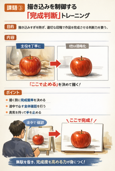 - 描き込みすぎを防ぐために、「どこで止めるか」の判断が重要になる。