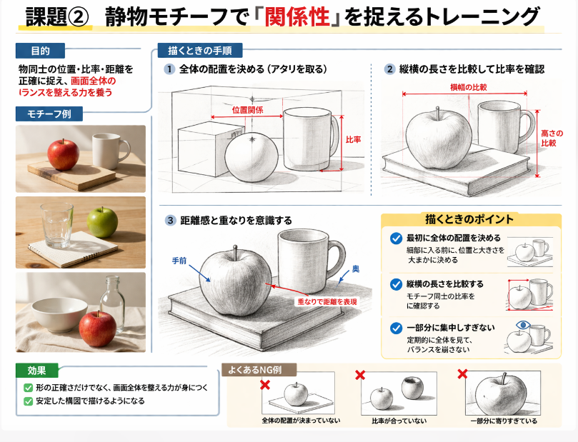 また、単体ではなく複数のモチーフを配置することで、構図の基礎にも自然と触れることができます。ここでの経験が、後の応用力に大きく影響します。