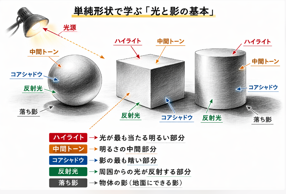 一見すると簡単に思えるこれらの形ですが、実際には光と影の関係、面の向き、明暗の変化といった、鉛筆画やデッサンの基礎となる要素がすべて含まれています。