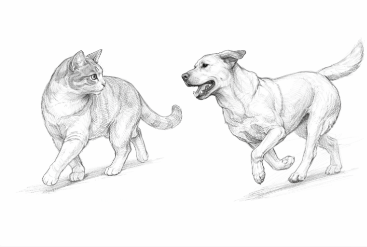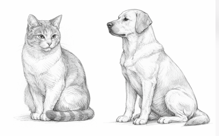 一般的に犬は胴が長く、頭部がやや小さく見える傾向があり、猫は頭部と胴体の距離が短く、全体がコンパクトにまとまります。この違いを意識せずに描くと、犬が猫のように見えたり、その逆になったりします。