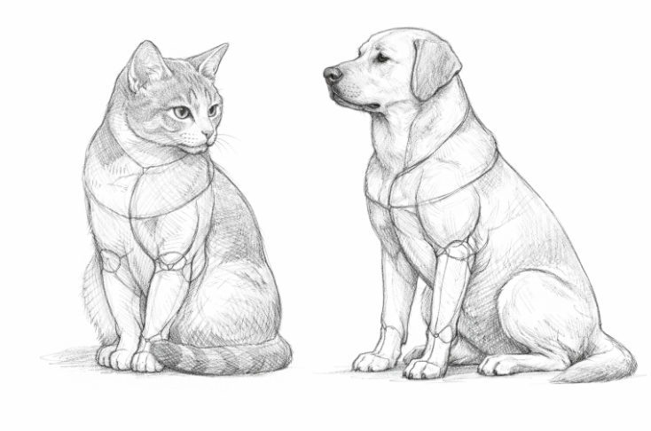 犬や猫の体を複数の単純な立体として捉え、全体配置と重心を先に決めることが、安定したデッサンの出発点になるでしょう。