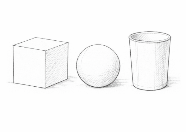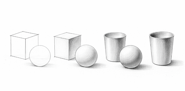 単純な静物(コップ・箱・球体など)をモチーフに設定し、陰影を一切つけずに輪郭と比率のみで完成させる。描き込みは禁止して、形の適切性だけに集中する。