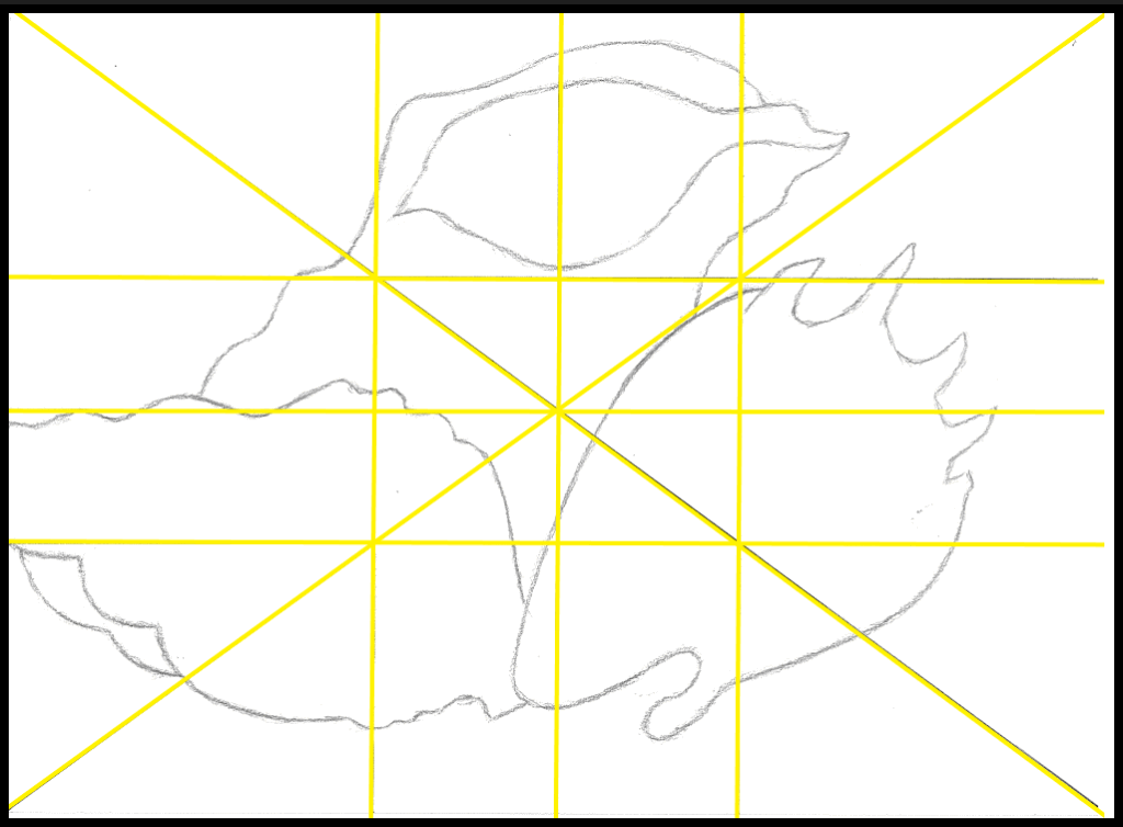 3分割法は、鉛筆画中級者にとってバランスを学ぶための有効な手段です。画面を縦横に3分割し、その交点や線上にモチーフを配置すると、自然で心地よい安定感が得られます。