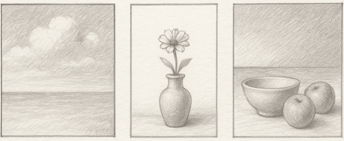 風景や小物の組み合わせを題材にし、枠線で切り取り方を変えて描きます。たとえば、風景なら地平線を高めに配置する場合と低めに配置する場合で印象がどう変わるかを確認します。