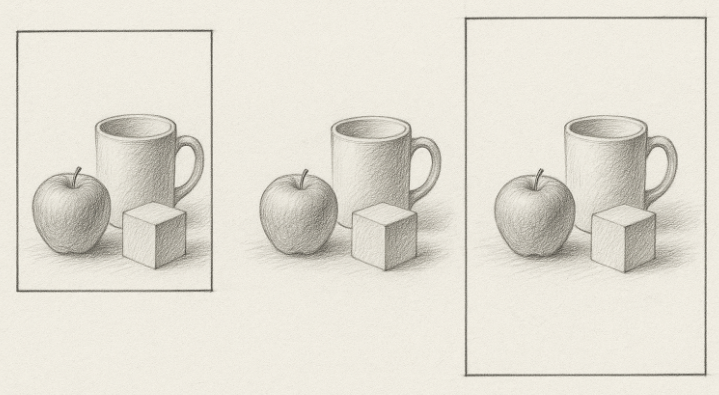 ひとつのモチーフ(例えばリンゴやカップ)を用意し、枠線を狭く取った場合・広く取った場合・中央配置にした場合の3種類を描き比べます。