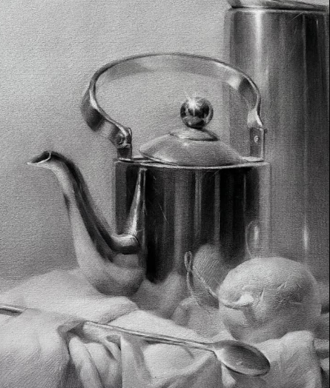 鉛筆による、静物デッサンの中間段階を経て、線と明暗の整理がある程度安定してこられましたら、次に取り組むべきは質感と空間の扱いです。