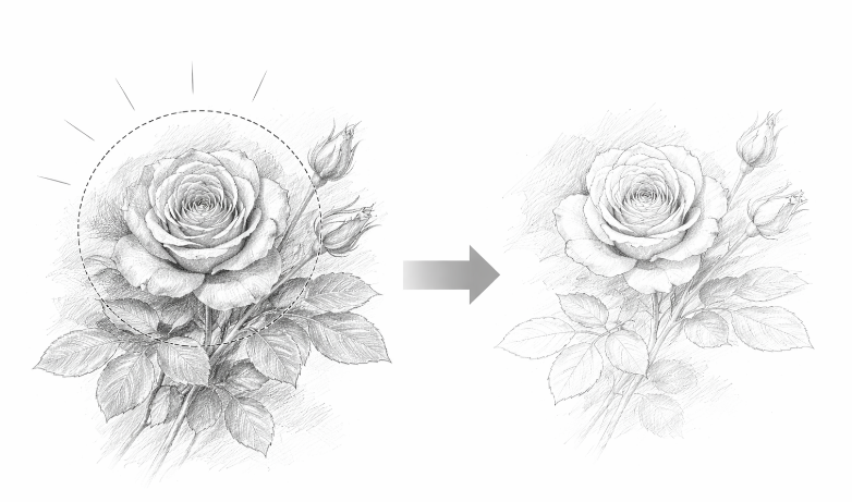 モチーフ(花・静物・動物など)を1つ設定し、「主役として見せる部分」を明確に1箇所決める。その主役部分のみ丁寧に描き込み、それ以外の部分は意図的に情報量を抑えて描く。