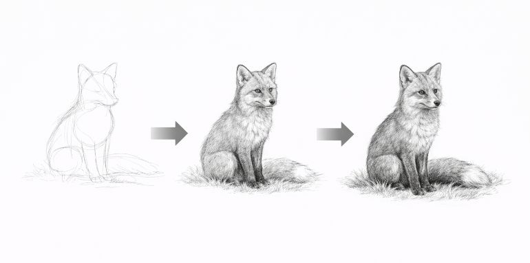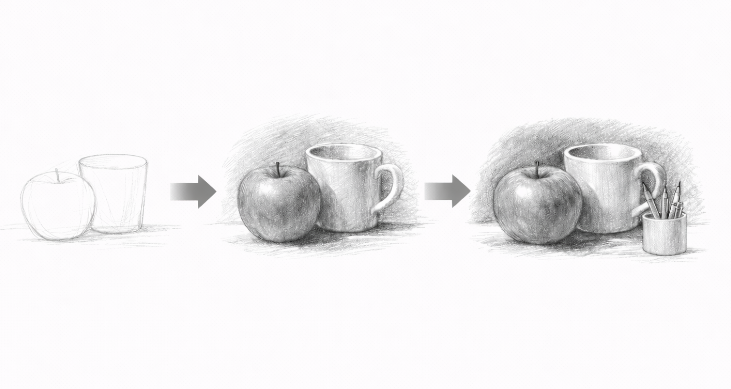 鉛筆画やデッサンは、描く技術以上に「進め方」が重要です。3段階思考を意識することで、迷いは大幅に減り、途中で手が止まることはほとんどなくなります。